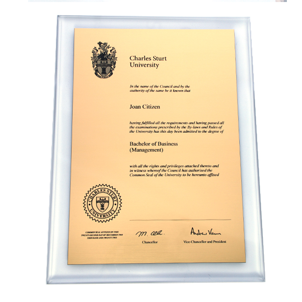 Your testamur printed onto a plate, mounted on acrylic