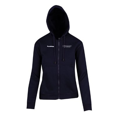 | 65% polyester/35% cotton 320GSM navy zippered Hoodie. Embroidered with university logo and school name. Unisex sizing